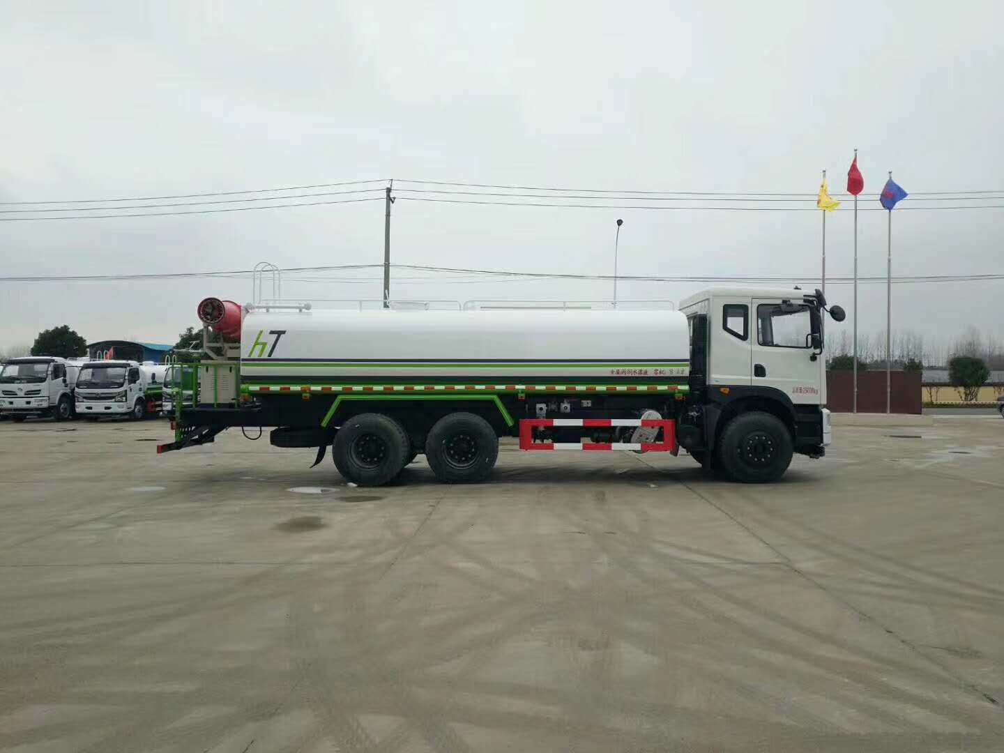 | 整车说明: | 选装驾驶室,驾驶室遮阳板为选装件.选装后高位花洒,选装方圆管道箱,选装后雾炮装置,选装后弧形喷雾.选装LED箭头指示灯,选装后平台式样,选装喷枪安装位置。仅采用4350+1350轴距底盘。罐体有效容积15.75立方米;运输介质:水,密度:1000千克/立方米;罐体外形尺寸(长度×长轴×短轴)(mm):6500×2280×1550。侧防护采用冷弯型钢/Q235,螺栓连接。后防护采用冷弯型钢/Q235,焊接连接。后防护截面高度尺寸120mm,截面宽度尺寸50mm,下边缘离地高度500mm。ABS型号/生成厂家:3631010-C2000/东科克诺尔商用车制动系统(十堰)有限公司。专用装置主要是罐体和喷洒系统,用于园林绿化,喷洒作业.选装后平台样式,外观样式及左右出水口附件位置。 | ||